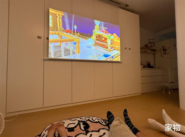 桌子的对面,则是一整面墙的高柜,当作家中的衣柜和收纳柜使用,柜子的顶部安装了电动幕布,甚至叫家人朋友来作客时,还可以坐在柜子对面,一起看看电视聊聊天,说起来倒也蛮有趣的。