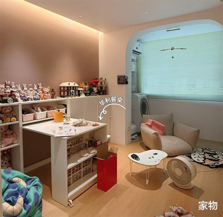 所谓的客厅空间,用半墙柜+折叠桌打造,做出了一个靠墙的双人位小桌,平时吃饭、工作、看电视,都会坐在这张桌子前。