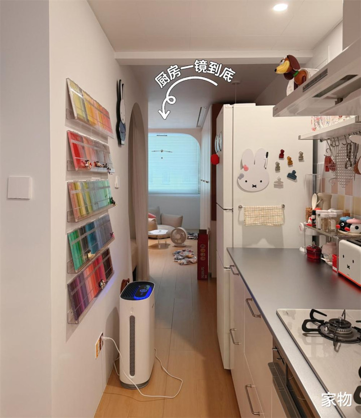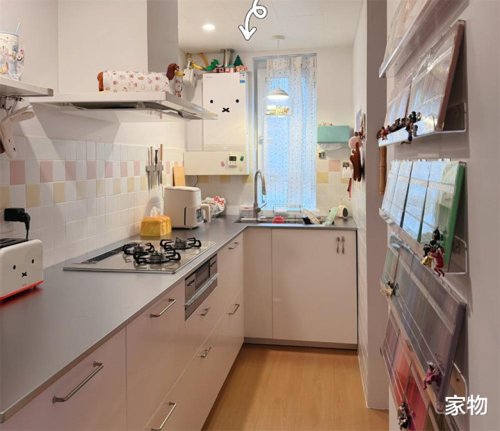 做完橱柜后,依旧留有一条狭窄的通道通往室内,且不得不说,这橱柜不锈钢台面搭配白色柜体实在是太有质感了,甚至让这窄小的空间都显得没那么憋屈了。