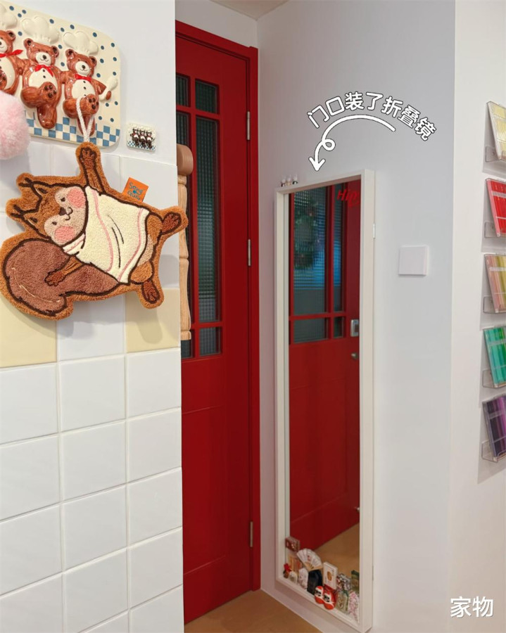 进门有个小小的玄关过度区,她在这里安装一扇内门,将玄关鞋柜隔断在外,而门内则做折叠镜,镜子带合页,打开后里面可以挂些项链耳环之类的首饰,因为镜子较厚,顶部也可以放些小小的装饰品。