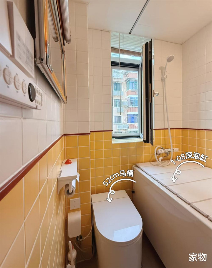 她在马桶旁边,甚至还放上了一个深泡浴缸,既可以当作淋浴区,又能偶尔泡个澡放松放松身体,舒适性拉满。