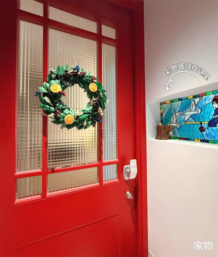 门的另一边,有一扇半透明的彩绘玻璃镜,它的后面其实是卫生间,做成半透明的镜子后不仅为白墙增添了装饰,又增加了玄关门廊内的采光,让这小空间不至于显得太过昏暗压抑,好看又实用。