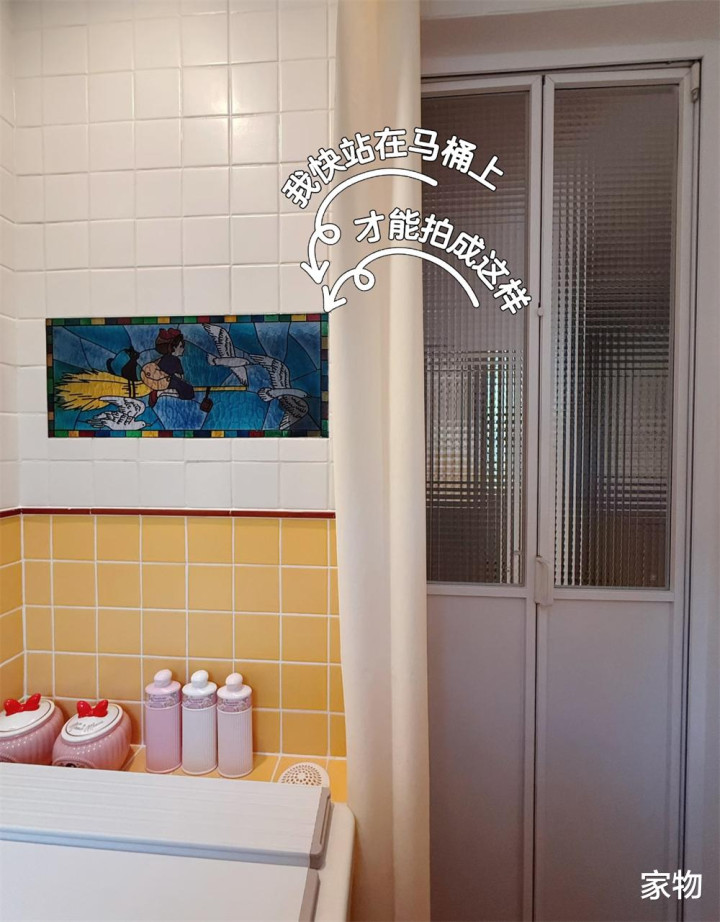 还记得一开始说的玻璃花砖么?它其实就在浴缸顶部,《魔女宅急便》的图案也显得饶有趣味。