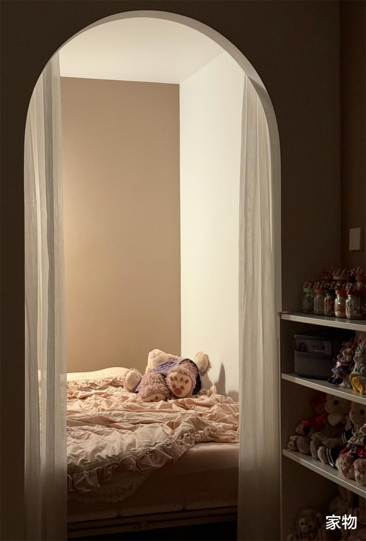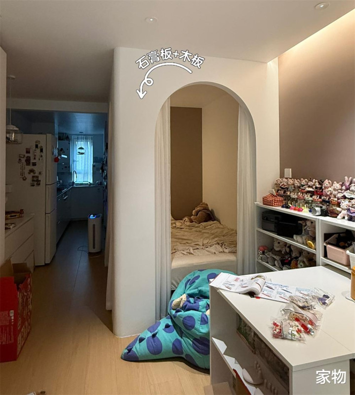 原本的开放空间,现在做出了石膏板和木板作为拱形门和隔断,切分出了一间双人床大小的卧室,且从床尾和床边都能躺到床上,动线十分灵活。