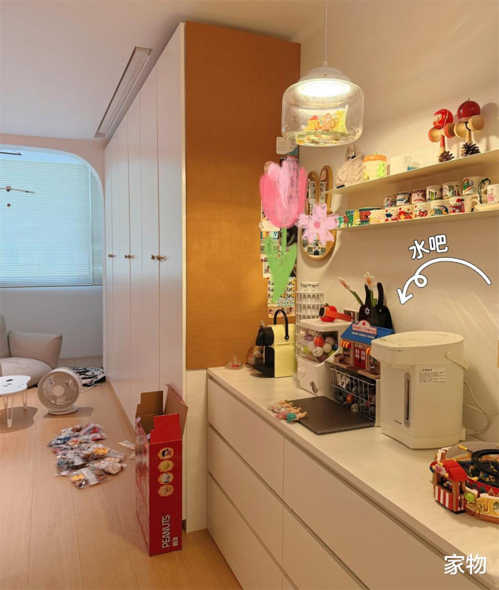 厨房的柜子,一直延伸到屋内,中间隔出了一个六斗柜,柜面当作水吧,上面也有两层架子放置杯盏装饰物。
