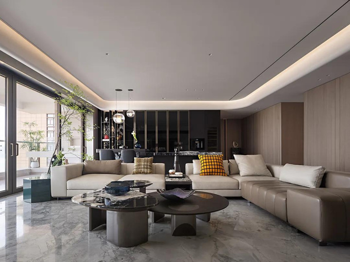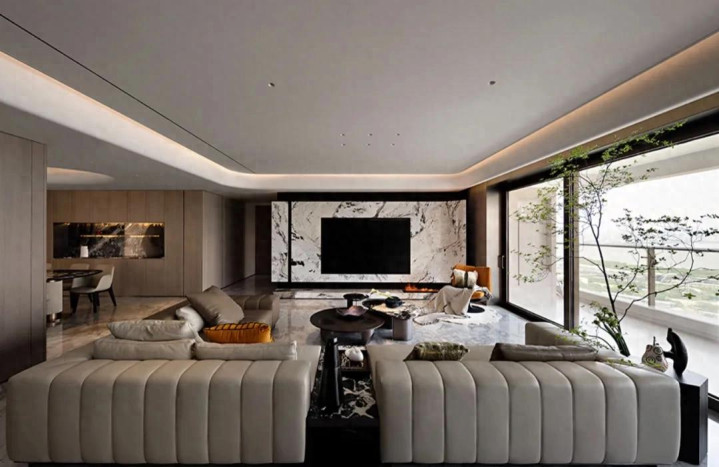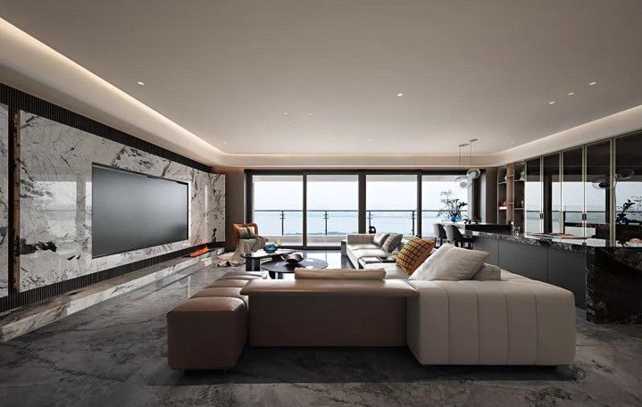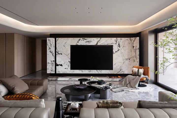 客厅以宽敞大气为底色,大型沙发稳稳围合出核心活动区,既标定了空间功能,又透着踏实的舒适感。细节处更见巧思:克制规整的横纵肌理,恰好呼应着大理石天然无序的纹路。