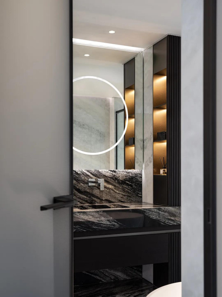 黑曜石的深邃与暖色光线的柔和碰撞融合,让浴室的视觉质感更显高级。