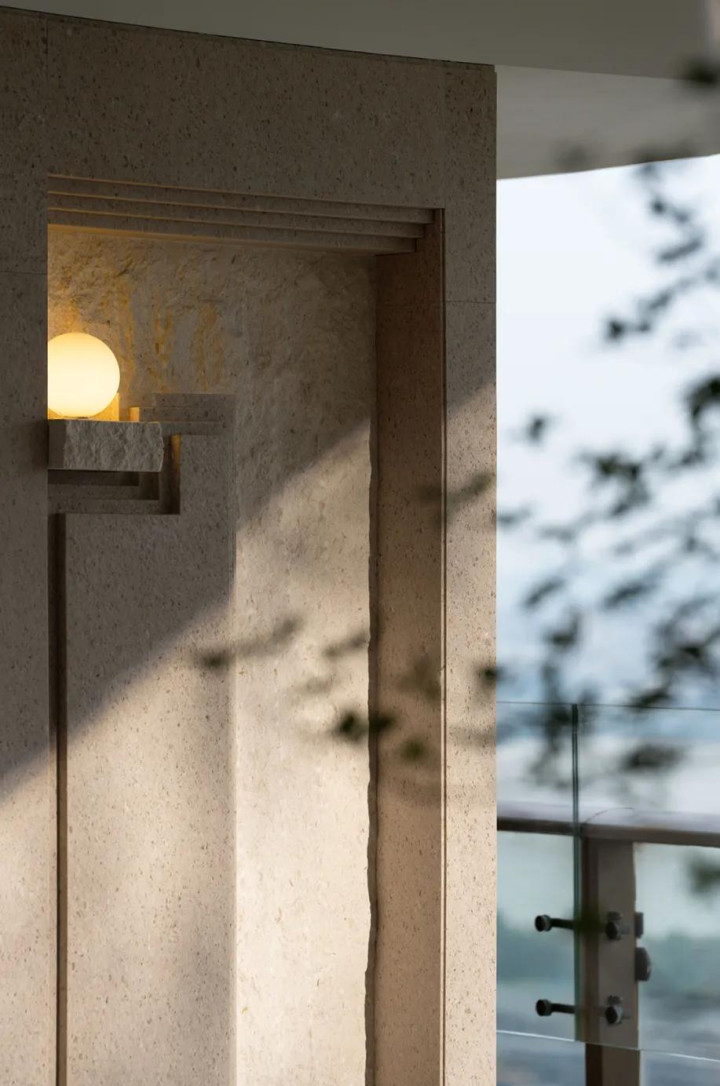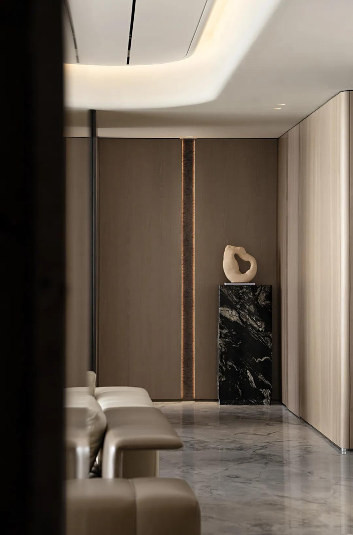 现代简约的质感并未让空间显得平淡,细节正是关键,角落的艺术品自带存在感,墙面的镌刻线条充满设计感,二者都在默默校准着空间的视觉尺度。