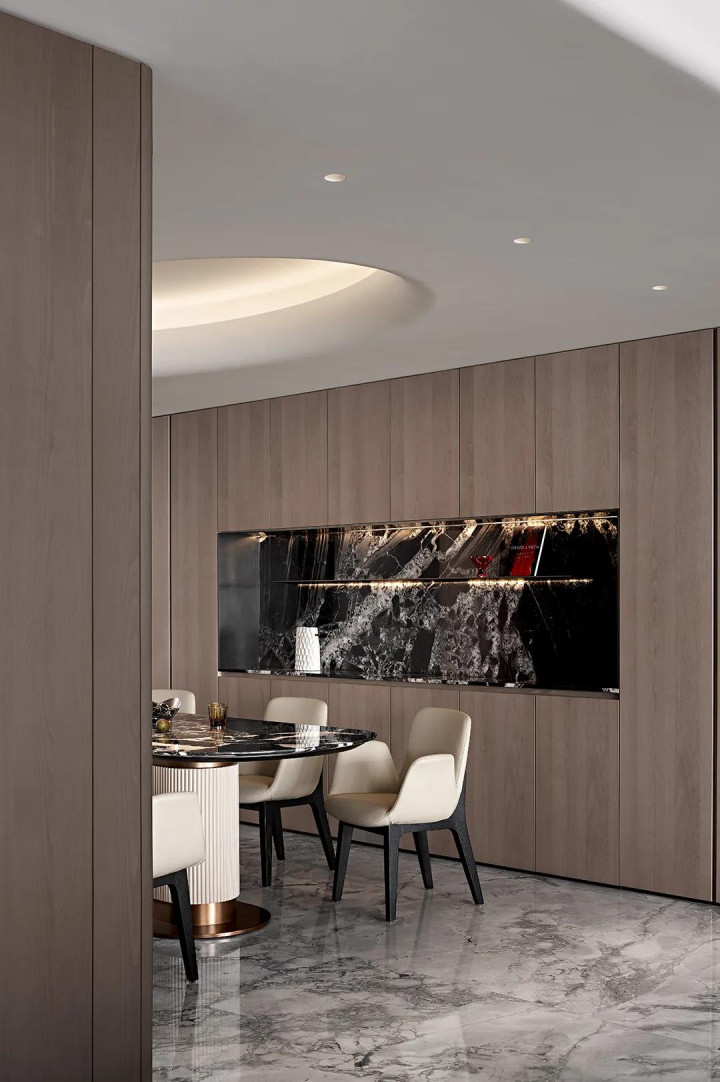 餐厅巧妙“藏”在角落,尺寸虽不张扬却自洽舒适,不显局促反而透着宽敞随性。木色的温和与大理石的质感在此交融,既营造出柔和氛围,又注入了生活的烟火气。