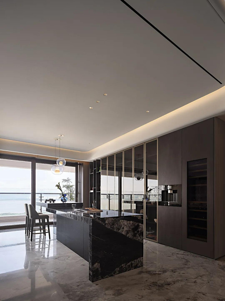 克制的空间美学与实用功能感完全不冲突,后侧西厨用嵌入式设计将所需功能统统藏进墙壁,既保持了视觉整洁,又没浪费实用性。最后,一座延伸的岛台让西厨功能更丰富。