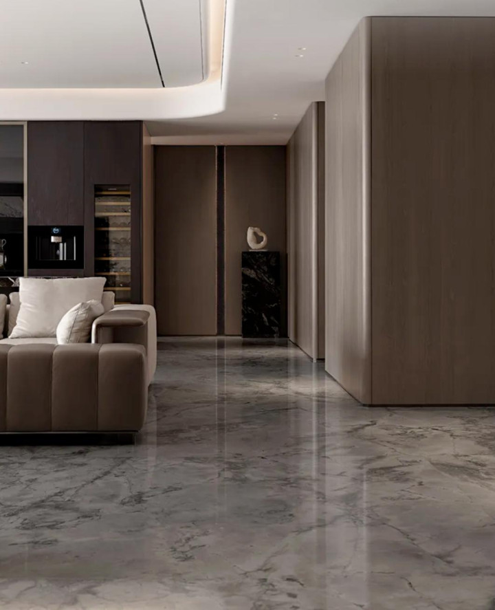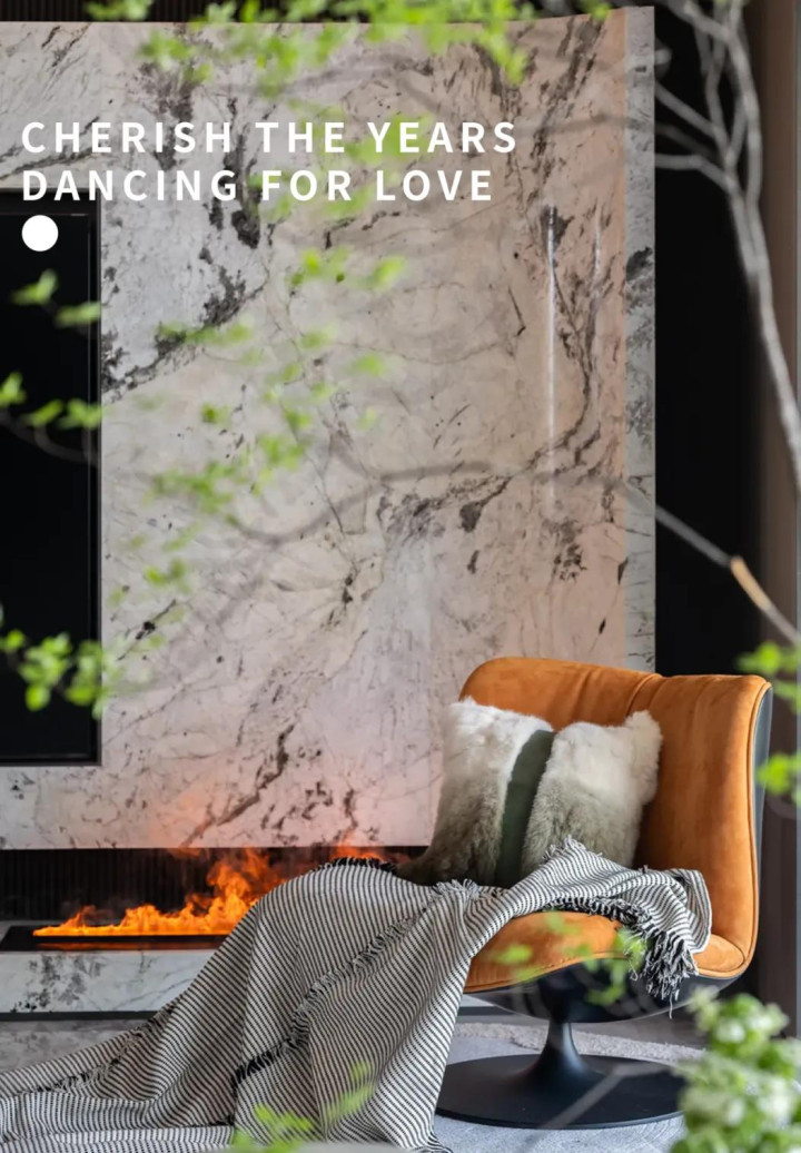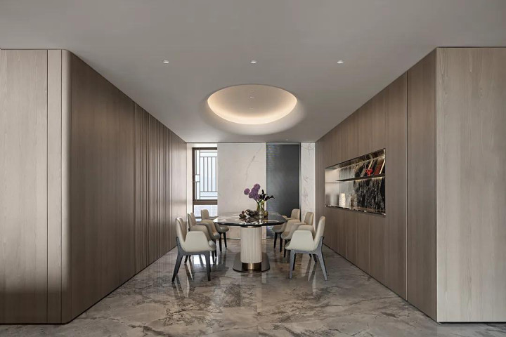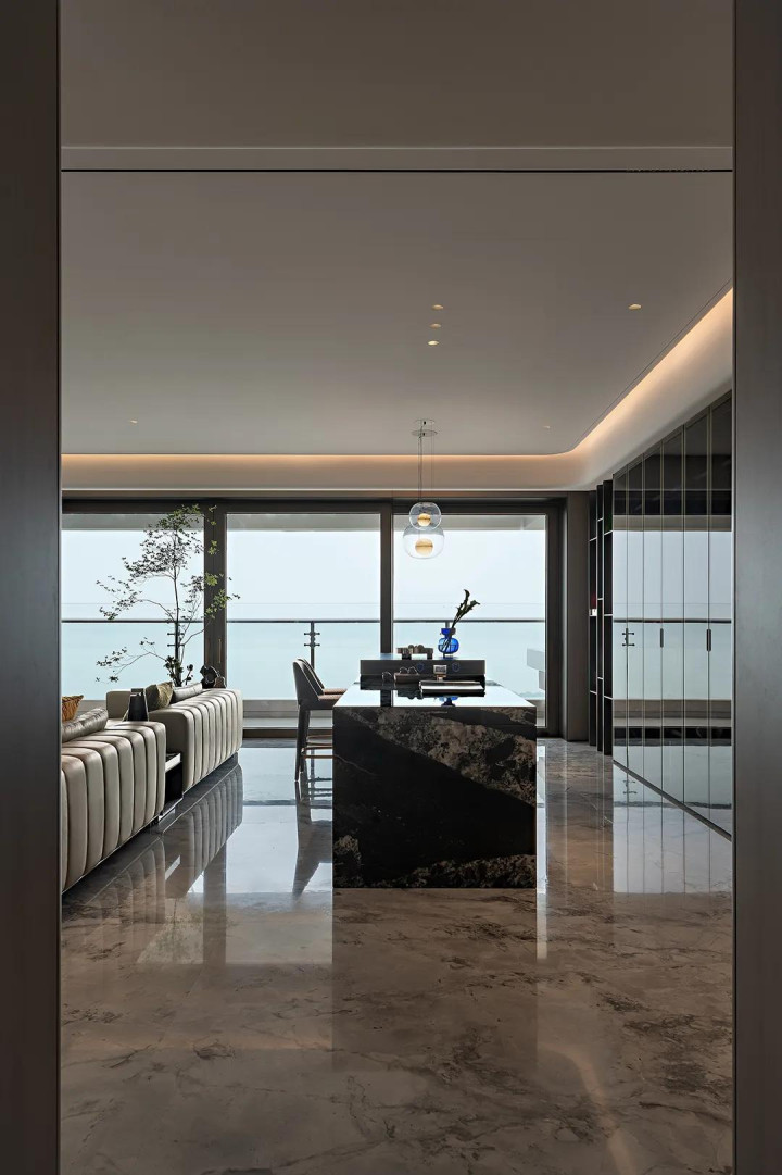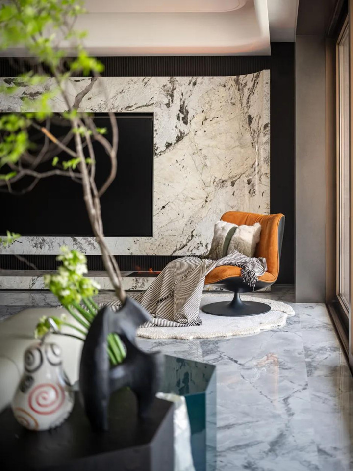 空间以大理石为基底,暖白色调裹着细腻质感,悄悄晕开瑰丽又不张扬的氛围。大型家具顺着空间尺度自然延伸,不拥挤、不局促。