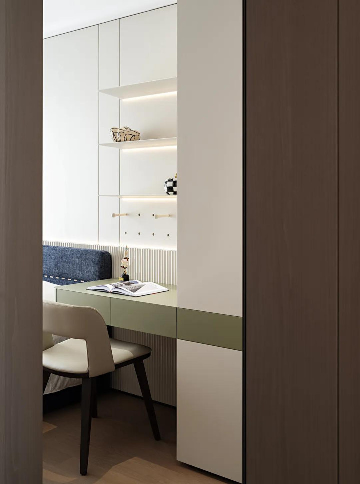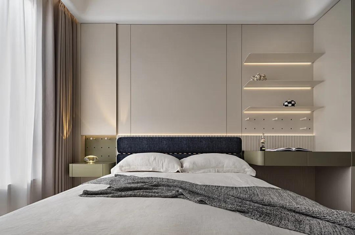 对称格局为卧室奠定了和谐温暖的基调,墨绿色悬浮床头设计不仅视觉亮眼,更精准呼应了空间对功能感的需求,利落又不占地面空间。