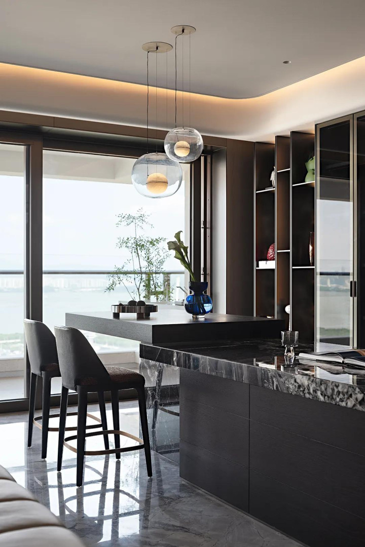 黑色岛台精准适配空间背景色,在色彩搭配上达成和谐统一,避免了视觉割裂。